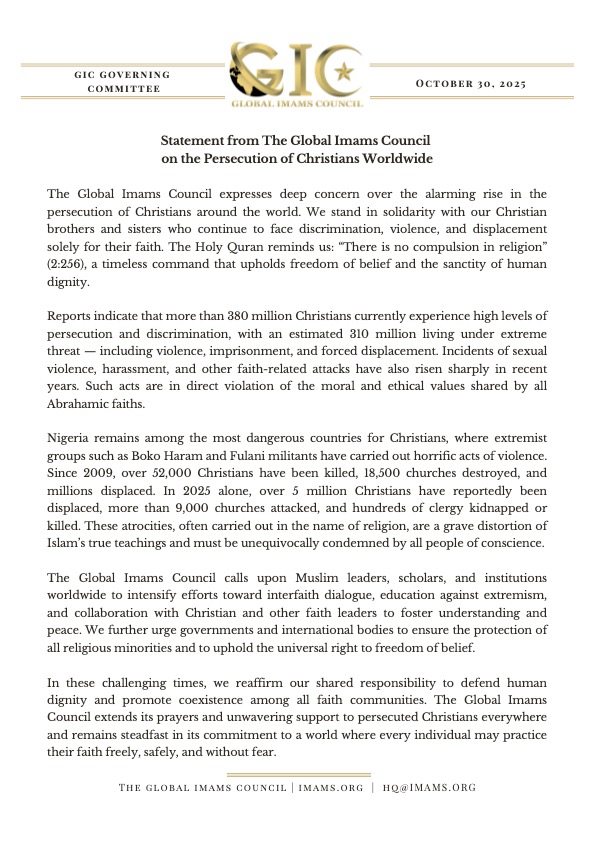 In these challenging times, we reaffirm our shared responsibility to defend hum an dignity and promote coexistence among all faith communities. The Global Imams Council extends its prayers and unwavering support to persecuted Christians everywhere and remains steadfast in its commitment to a world where every individual m ay practice their faith freely, safely, and without fear.