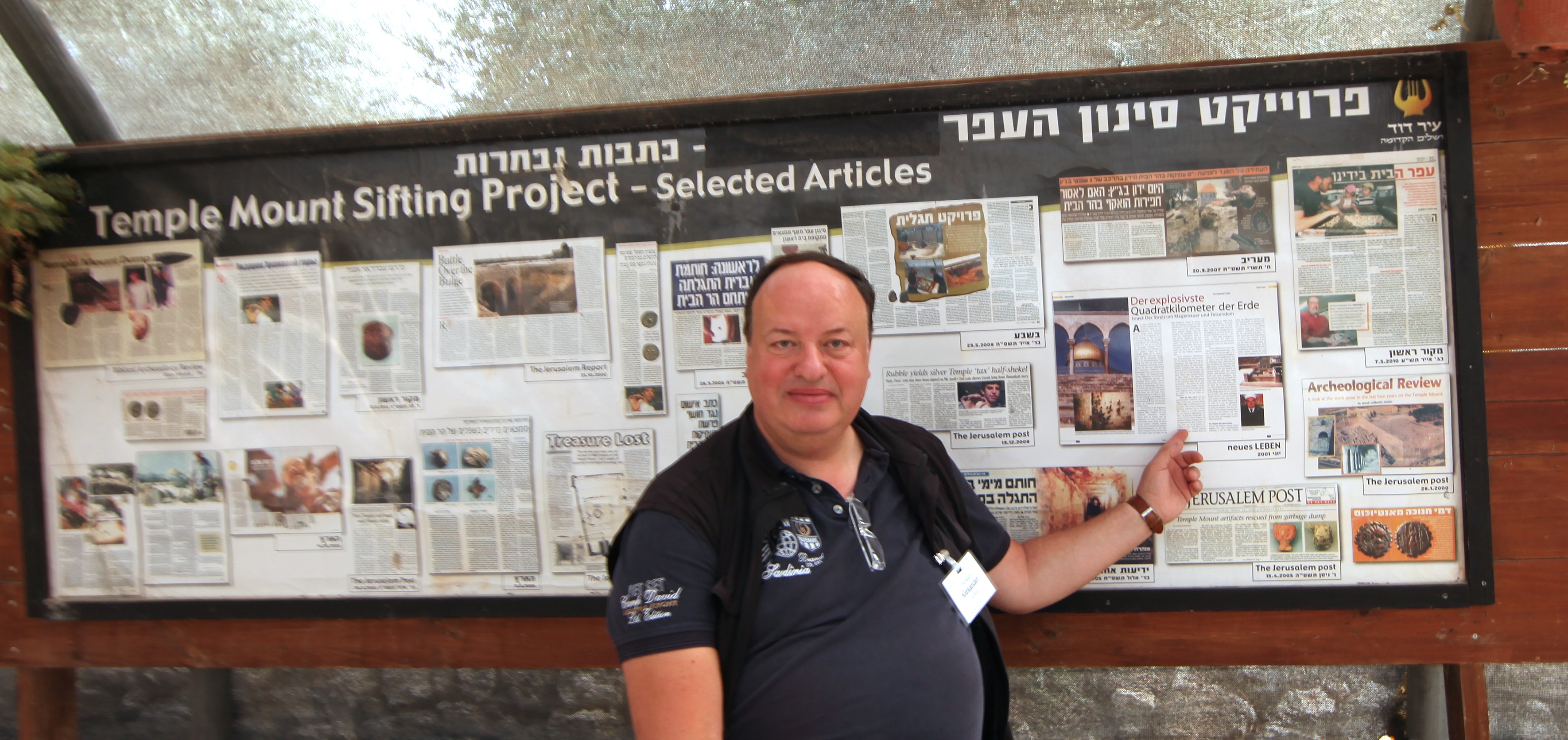 - Photo 2: Alexander Schick points to his article in the The Temple Mount Sifting Project © Bibelausstellung Sylt/Alexander Schick